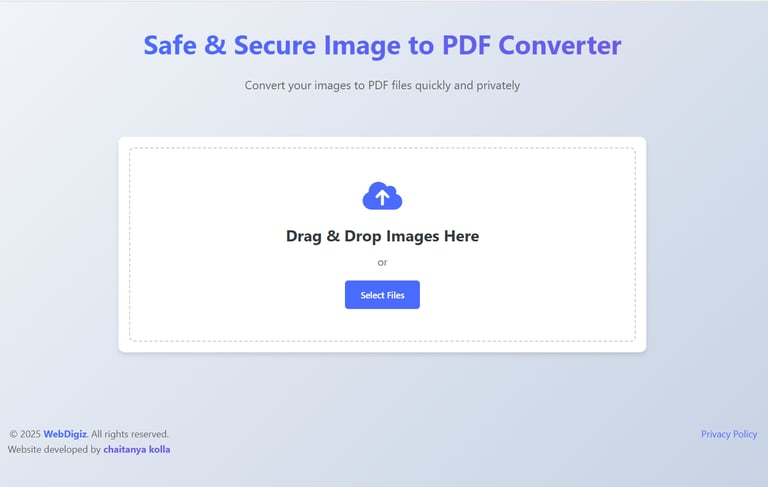 We developed this website as a webdigiz own project..Here we can upload any photo and it will turn into pdf which is safe and secure... We won't store your photos because we are just using javascript only... Try this now